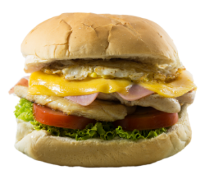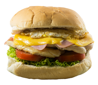Maionese, alface, tomate, queijo prato, presunto, ovo e filé de frango.